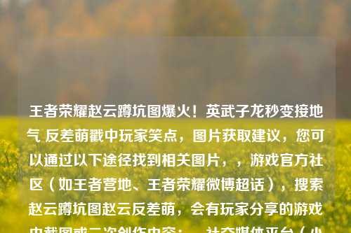 王者荣耀赵云蹲坑图爆火!英武子龙秒变接地气 反差萌戳中玩家笑点,图片获取建议,您可以通过以下途径找到相关图片,,游戏官方社区(如王者营地、王者荣耀微博超话),搜索赵云蹲坑图赵云反差萌,会有玩家分享的游戏内截图或二次创作内容;,社交媒体平台(小红书、抖音),输入关键词王者荣耀赵云蹲坑,能找到大量玩家发布的趣味图片;,图片素材网站(如摄图网、千库网),搜索王者荣耀赵云,筛选趣味反差标签,可获取合规的创意图片(注意版权使用规则)。,如果需要具体图片链接,建议直接在上述平台搜索关键词,能快速找到您想要的